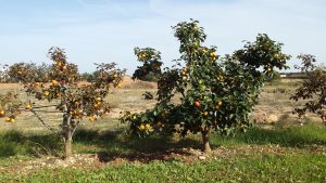 The tree on the left that corresponds to the D. Lotus rootstock, and it has lower vigour, less leaf density and size, burnt leaves borders and smaller fruit size are observed. The tree on the right correspond to the D. virginiana rootstock and it grows perfectly.